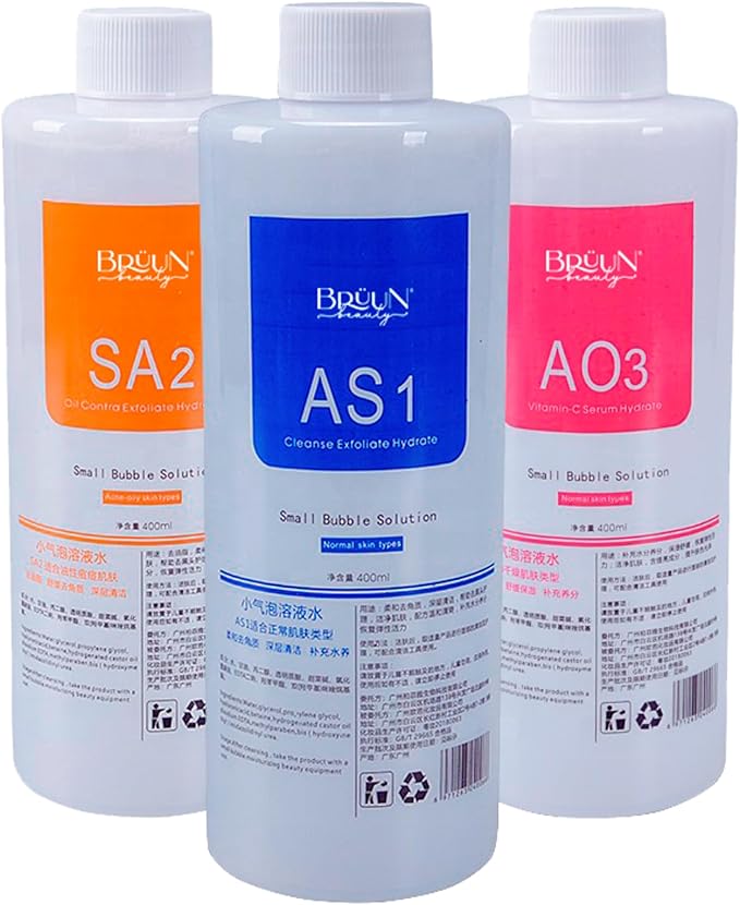 BRÜUN Hydrogen Oxygen Facial Machine Serums for Facial Cleansing – A Pack of 400ml 3 Aqua Peeling Solution AS1, SA2, and AO3 –Skin Care Hydra Solution for Vacuum face Cleaning Jet for Home and Spa