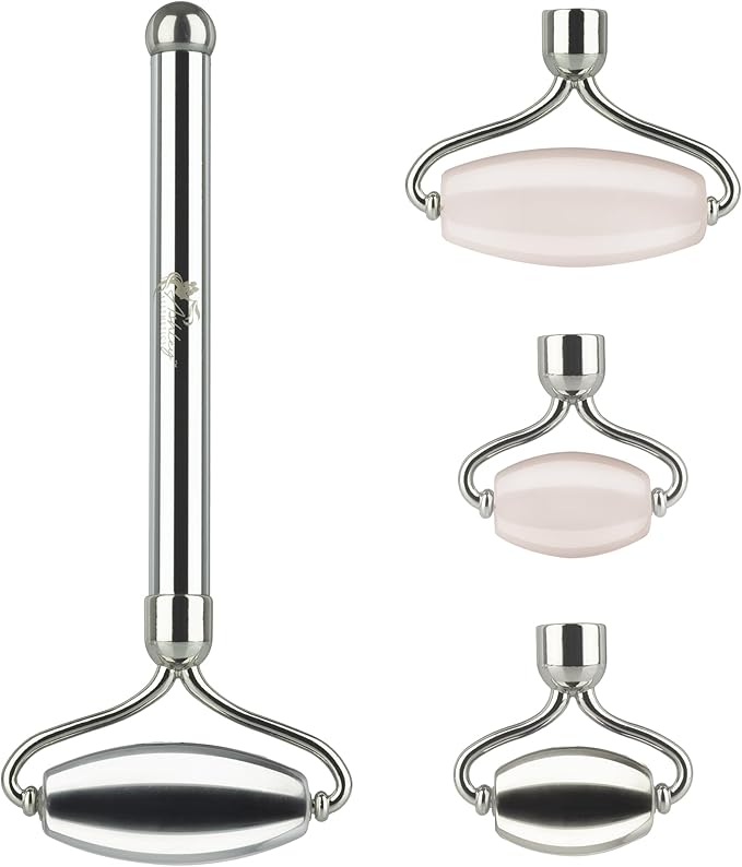 - 5 Piece Set - 1 Handle, 1 SS Large Head, 1 SS Small Head, 1 Rose Quartz Large Head, and 1 Rose Quartz Small Head - The Small Roller Heads Are Great For Under The Eyes and Around The Nose.