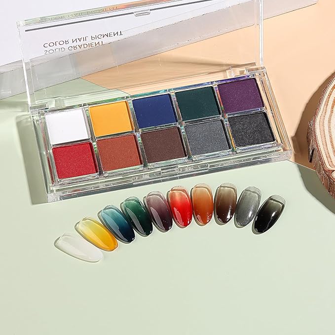 - 【YOU WILL GET】 10 colors in one palette solid nail powder and 10 doubled-head sponge sticks for rubbing nail pigment.